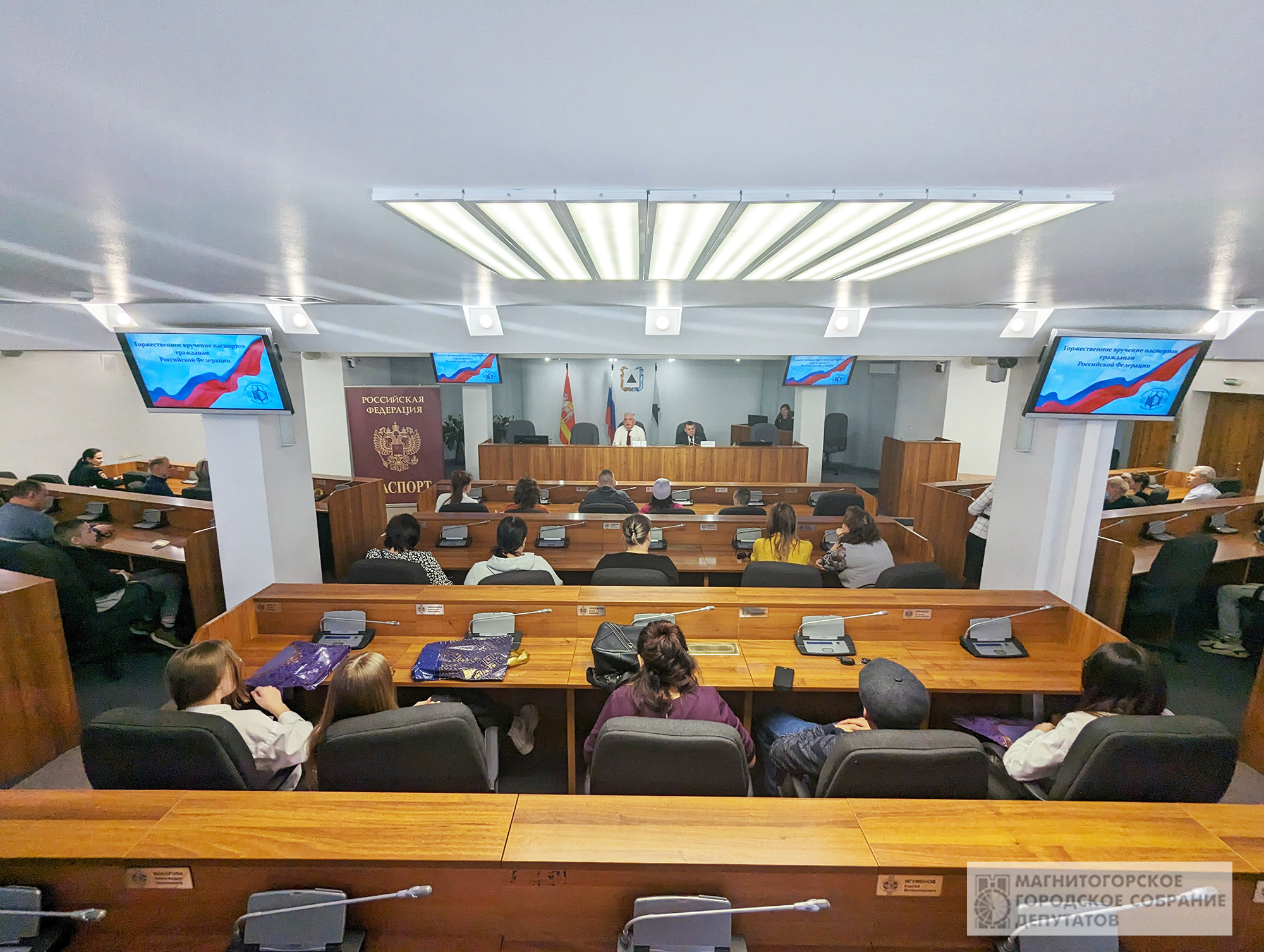 Пятнадцать 14-летних граждан России в присутствии их родителей получили паспорта из рук председателя Городского Собрания Александра Морозова и депутата Законодательного Собрания Челябинской области Дмитрия Мельникова.