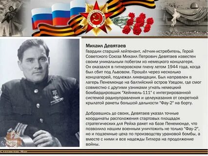 Михаил Девятаев – летчик-истребитель, гвардии старший сержант. Вместе с девятью узниками концлагеря угнал самолет, и сбежал из плена. Получил звание Героя Советского Союза.