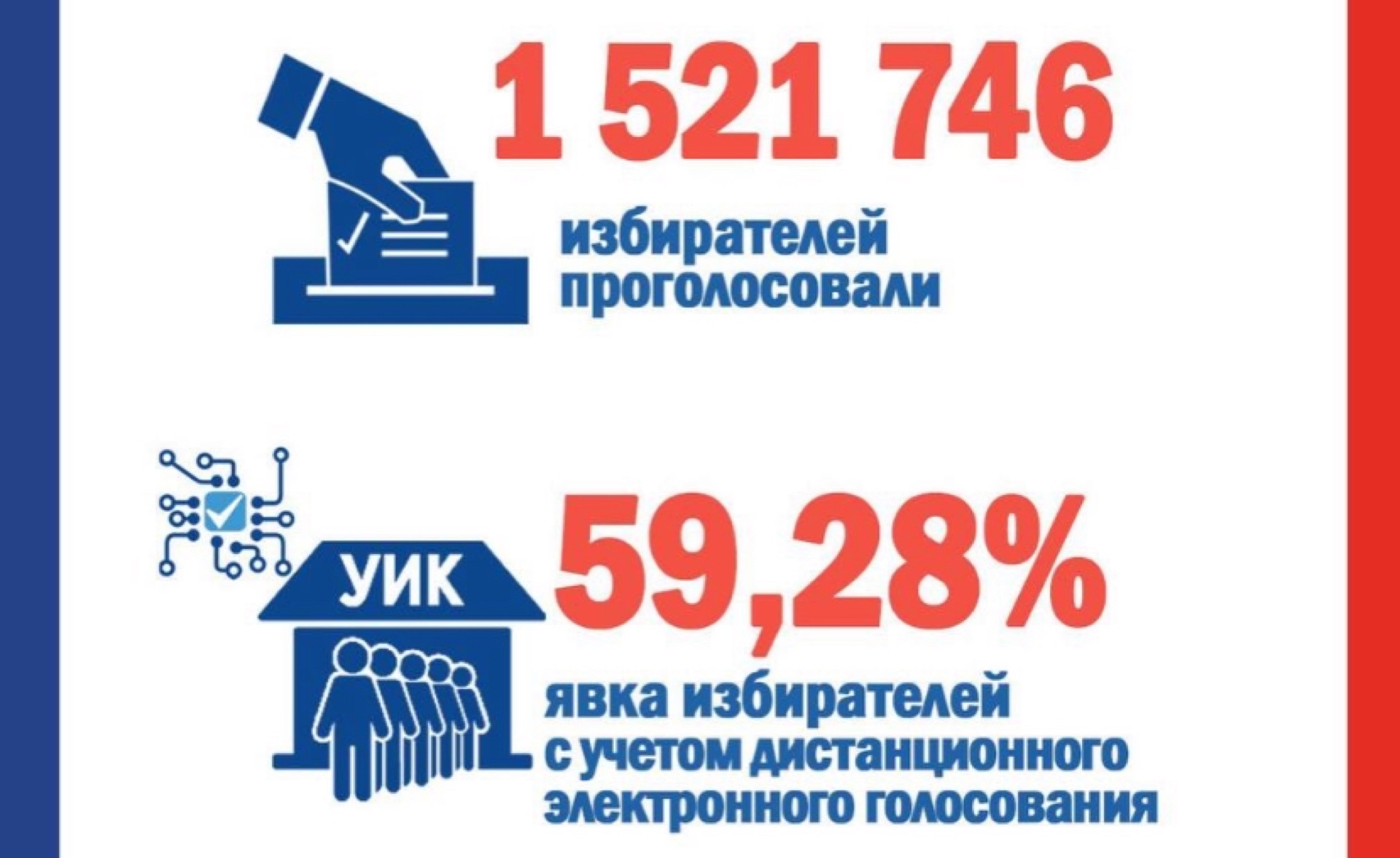 В избирательной комиссии Челябинской области подвели итоги сегодняшнего дня: на 20:00 проголосовало 1 521 746 избирателей, что составило 59,28 %, с учетом ДЭГ. На 22:15 дистанционно успели проголосовать 205 941 человек — 88% зарегистрированных пользователей.