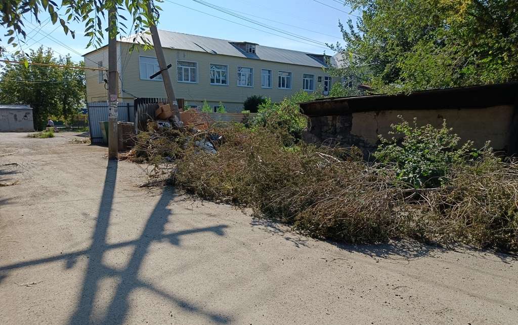 Не радует ситуация у школы искусств. Ветки, трава и строительный мусор образовали завал до следующего здания. Пугающая картина.