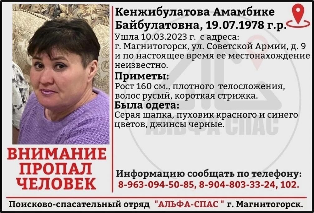 Амамбике Кенжибулатова 10 марта этого года ушла с адреса: Магнитогорск, улица Советской Армии, дом 9. По настоящее время местонахождение 44-летней женщины неизвестно.