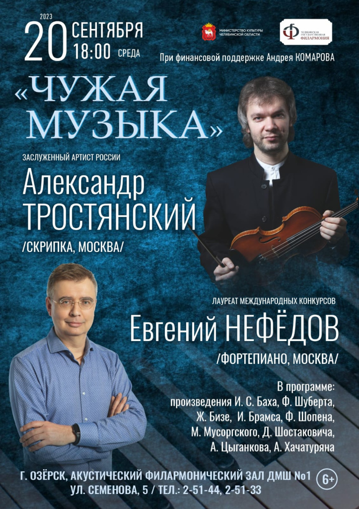 В увлекательный музыкальный вояж приглашает программа великолепного скрипача, Заслуженного артиста РФ Александра Тростянского (Москва) и лауреата международных конкурсов, пианиста Евгения Нефёдова (Москва/Португалия).