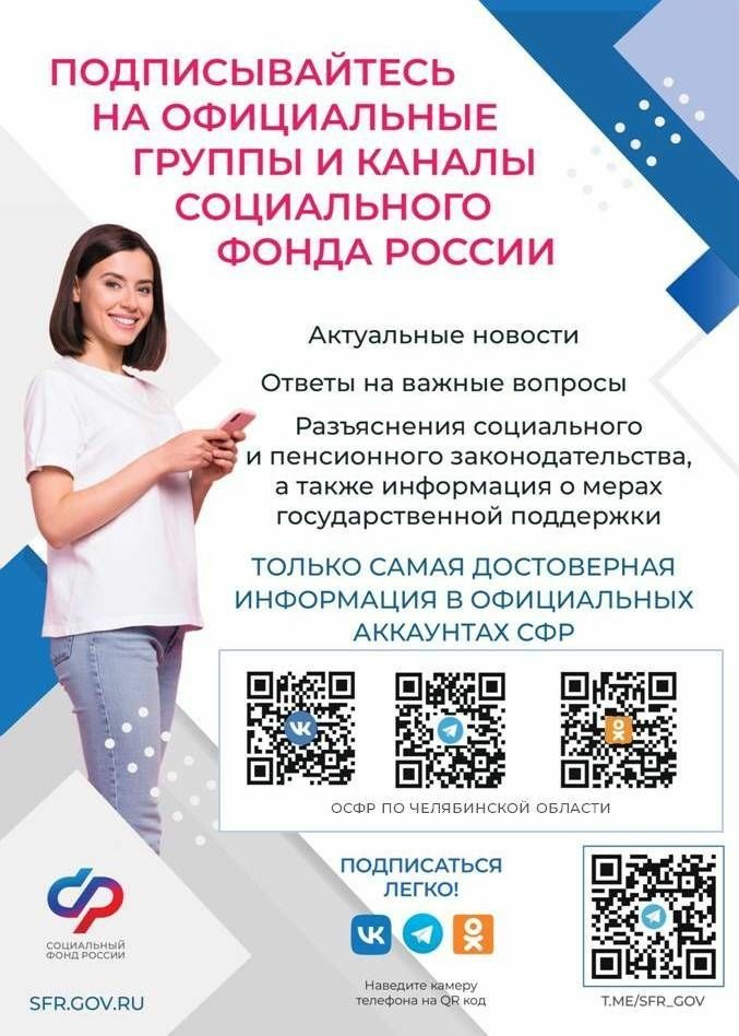 Telegram-канал Социального фонда России: https://t.me/sfr_gov Telegram-канал ОСФР по Челябинской области: https://t.me/sfr_chelyabinskaya_oblast Официальная группа ОСФР по Челябинской области во Вконтакте: