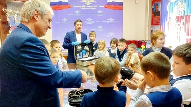 Начальник отделения по г.Озерску межрайонного отдела «Северный» (дислокация г.Озерск) ЭКЦ майор полиции Александр Багаутдинов рассказал о криминалистической технике, показал детям, как отбираются следы на месте преступления.
