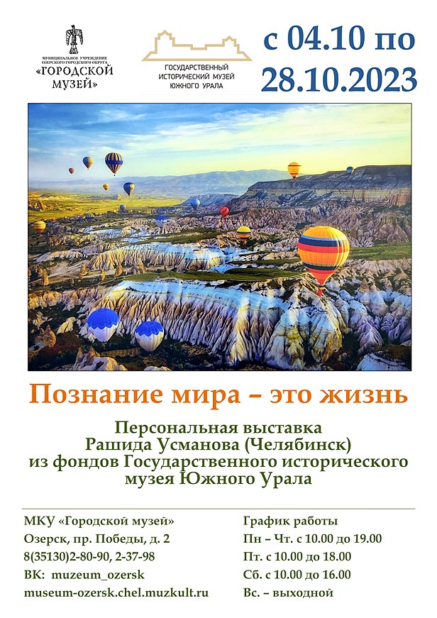 С 4 октября в Озерском городском музее открывается персональная фотовыставка известного челябинского фотографа Рашида Усманова «Познание мира – это жизнь» из фондов Государственного исторического музея Южного Урала .