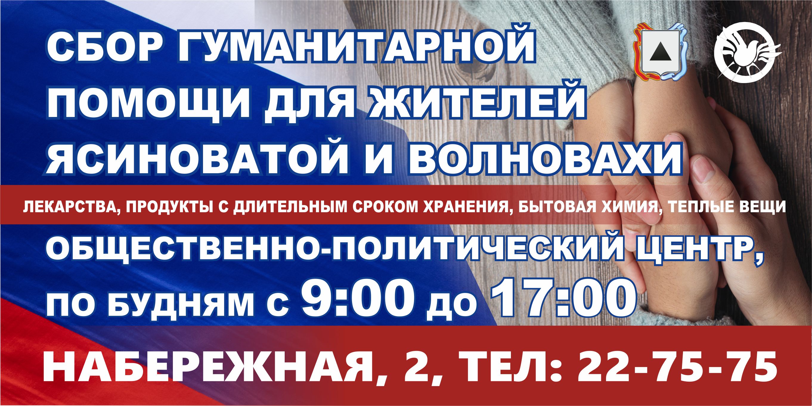 Работа по сбору гуманитарной помощи для жителей подшефных территорий Волновахского района и города Ясиноватая организована на базе Общественно-политического центра по адресу: улица Набережная, 2.