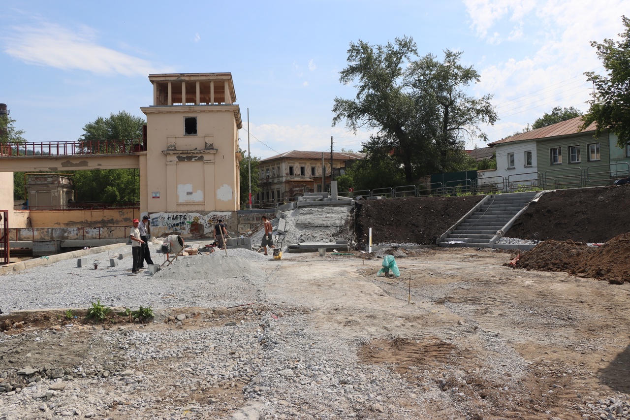 Сегодня территория будущей набережной уже очищена от кустарника и мелколесья. Подготовлены основания для дорожек, плиточных тротуаров, площадок. Подрядчик приступил к устройству лестничных маршей и газонов. Строительство объекта должно быть завершено в сентябре этого года.