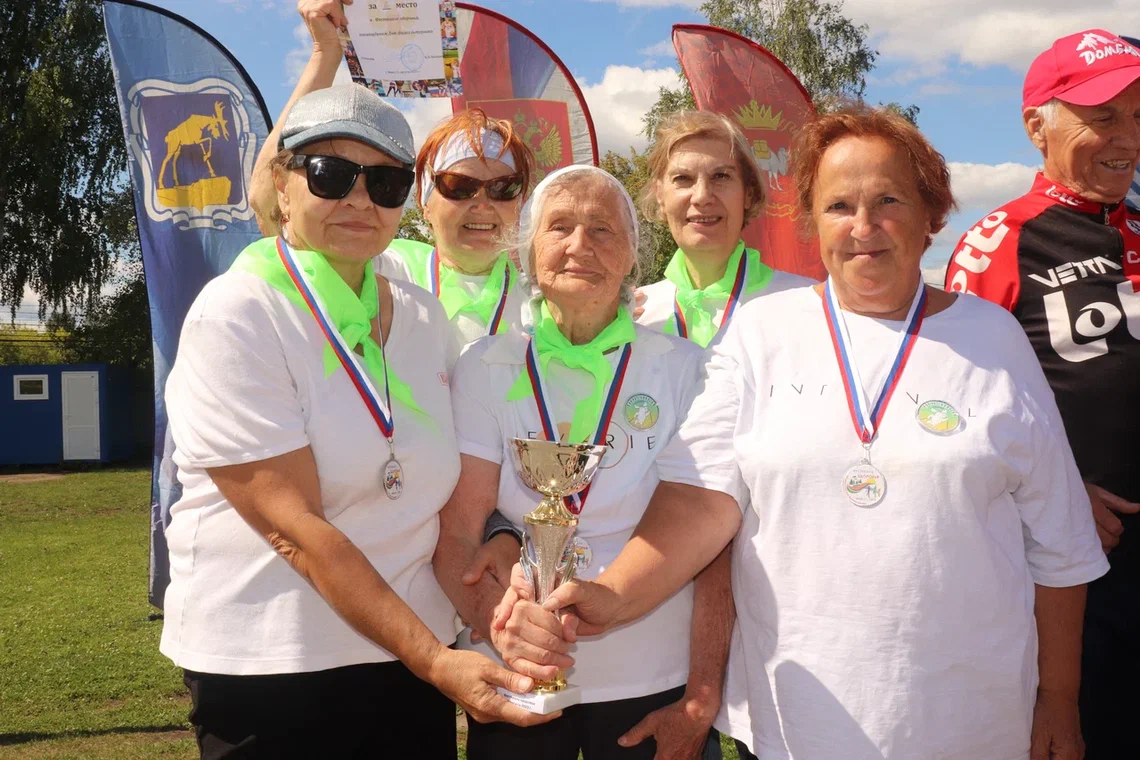 Участники фестиваля здоровья в г. Миассе в рамках Дня физкультурника, в центре 99-летняя Нурания Латыпова