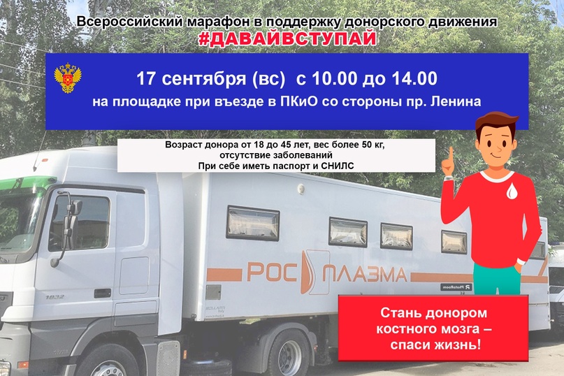 В это воскресенье, 17 сентября, 10 до 14 часов на площадке при въезде в Парк культуры и отдыха со стороны улицы Ленина будет работать мобильный пункт забора крови – модуль «Росплазма».