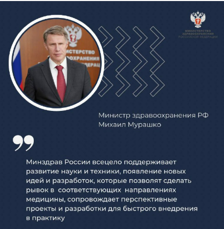 Минздрав России всецело поддерживает развитие науки и техники, появление новых идей и разработок, которые позволят сделать рывок в соответствующих направлениях медицины, сопровождает перспективные проекты и разработки для быстрого внедрения в практику, обеспечивает импортозамещение. На решение этих задач направлен и новый национальный проект «Новые технологии сбережения здоровья». Он позволит создать условия для внедрения результатов исследований в клиническую практику, в том числе в области превентивной медицины и технологий долголетия, а также обеспечить технологический суверенитет в создании лекарственных препаратов, биомедицинских клеточных продуктов, тканевой инженерии и медицинских изделий. Ведь наша главная цель – обеспечение доступности гражданам нашей страны инновационными лекарственными препаратами, медицинскими изделиями, современными методами и способами профилактики, диагностики, лечения и реабилитации.