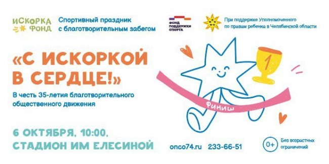 На стадионе имени Е. Елесиной 6 октября пройдет спортивный праздник для всей семьи с благотворительным забегом «С Искоркой в сердце». Мероприятие приурочено к 35-летию Благотворительного движения «Искорка Фонд», сообщают организаторы.