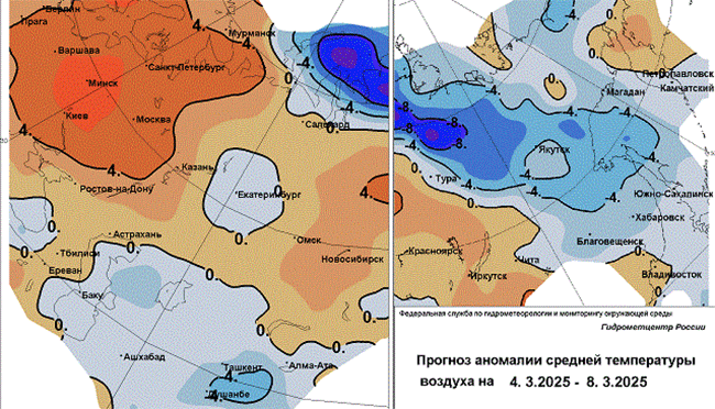 В среду облачно с прояснениями, преимущественно без осадков. Ветер восточный, юго-восточный 4-9 м/с. Температура воздуха 5 марта ночью минус 9-14, при прояснении – до 19, днем минус 1-6.