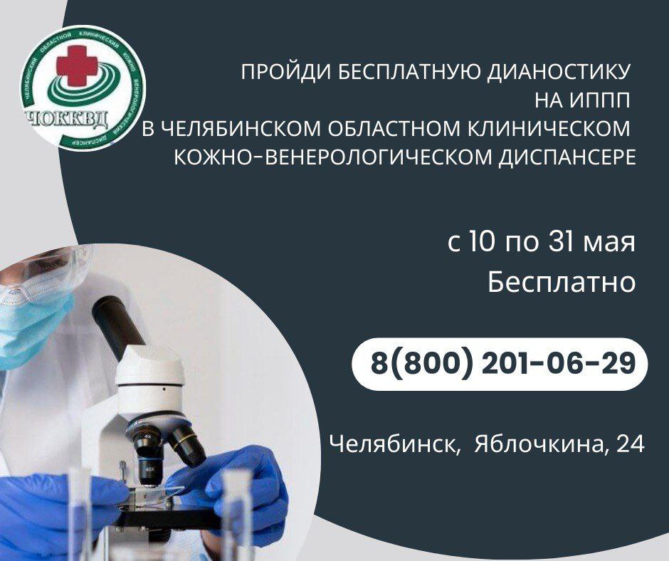 С 10 по 31 мая в рамках акции челябинцы могут бесплатно обследоваться на гепатиты В и С, сифилис и ВИЧ-инфекцию, гонококковую инфекцию, гарднереллез или бактериальный вагиноз, трихомониаз, кандидозную инфекцию. Пройти обследование можно в Челябинском областном клиническом кожно-венерологическом диспансере, на базе которого работает Центр диагностики и лечения инфекций, передающихся половым путём.