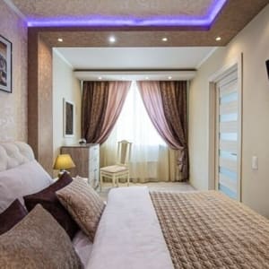 ✔ Атмосферная спальня в молочно-шоколадных тонах, с изысканной двуспальной кроватью с ортопедическим матрасом и плотными портьерами располагает к прекрасному отдыху и полной релаксации. Прикроватные тумбы с мягкой обивкой, красивые светильники дополняют обстановку домашнего уюта и тепла. Для личного ухода предусмотрен комод, использующийся как туалетный столик, настенное зеркало и удобный стул. В дизайнерском встроенном шкафу-купе можно разместить все вещи. Большая плазма на стене поможет разнообразить досуговое времяпрепровождение. Неоновая сиреневая подсветка впечатлит любого гостя.