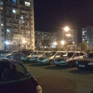 Большой двор со спортивной площадкой и с достаточным количеством парковочных мест.
