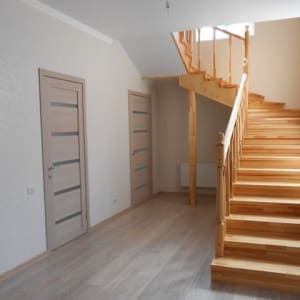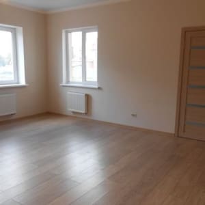 2-й этаж – холл 4, 9 кв.м, три комнаты ( 16, 6+24, 18+11, 7 кв.м), гардеробная комната площадью 6, 2 кв.м с окном; вход в санузел из гардеробной комнаты – акриловая ванна, мойка, туалет. Отделка в монохромной цветовой гамме, в светлых тонах: пол-ламинат, светлый пластиковый плинтус, обои универсальной нейтральной расцветки под любой интерьер, современные межкомнатные двери. Все абсолютно новое, в доме никто не проживал.
