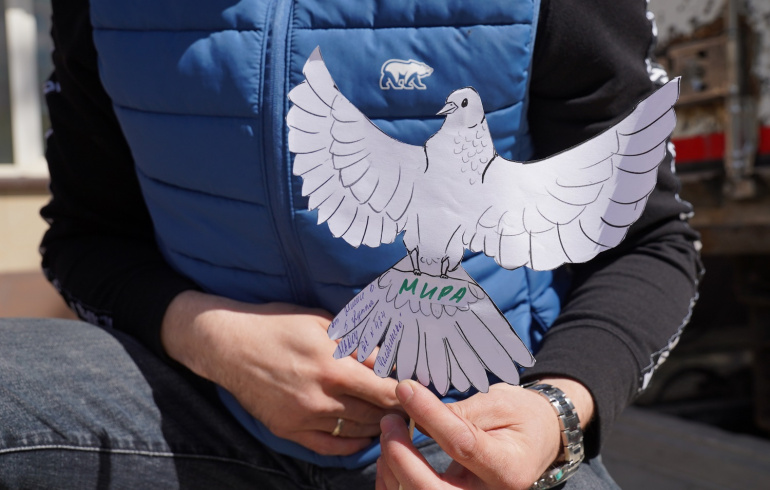 Отдельная коробка, которую бережно упаковывают и грузят, — с детскими рисунками и письмами от южноуральских школьников и студентов, письма-треугольники подписаны «Победа за нами!», «Мы очень вас ждём!», «Мы с вами, мы за вас, мы любим вас!».