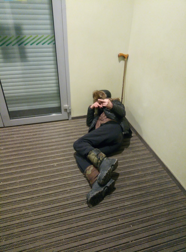 Сегодня вечером столкнулся с очень неприятной ситуацией. В предбаннике Сбербанка на Строительной, 56 спит пьяный бомж.